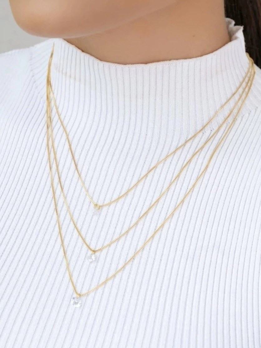 Esses colares são uma semijoia delicada e moderna, possui em cada corrente um ponto de luz de zircônia cristal que faz transbordar elegância ao seu estilo. Seja no dia a dia ou em momentos especiais, esta peça será o destaque perfeito para expressar sua autenticidade.