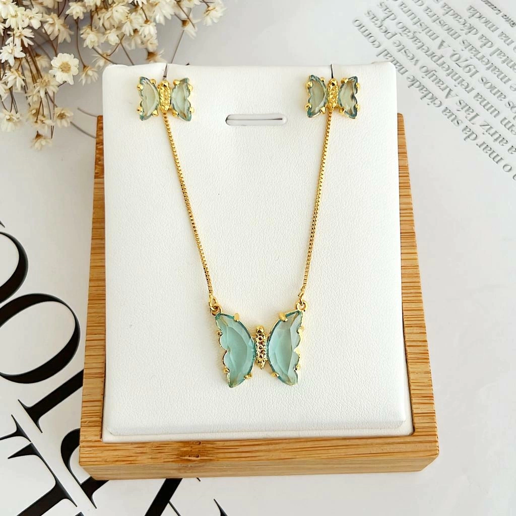 O conjunto colar e brincos com banho de ouro da Coleção Butterfly com zircônia Azul conta com um design elegante e brilho discreto onde cada detalhe foi pensado para completar e trazer mais beleza ao estilo de cada mulher.