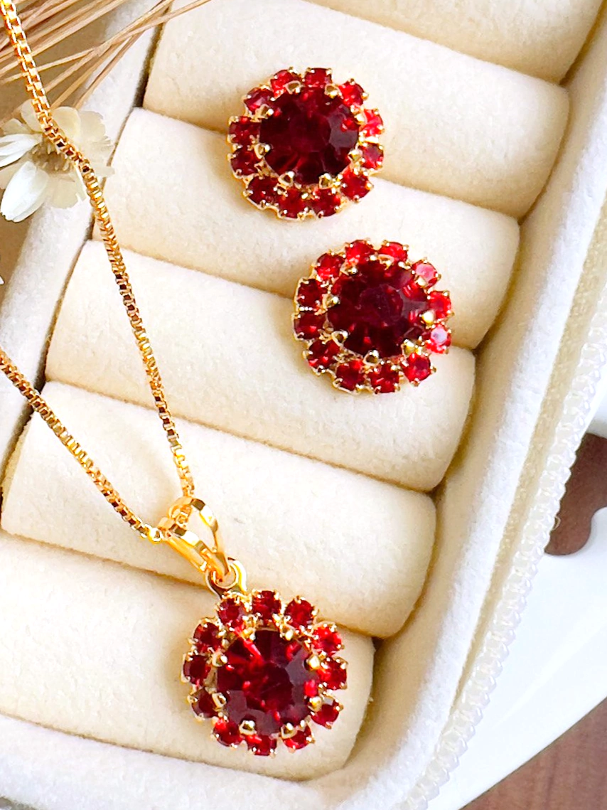 Design: Corrente e brincos dourados com pequenas pedras vermelhas