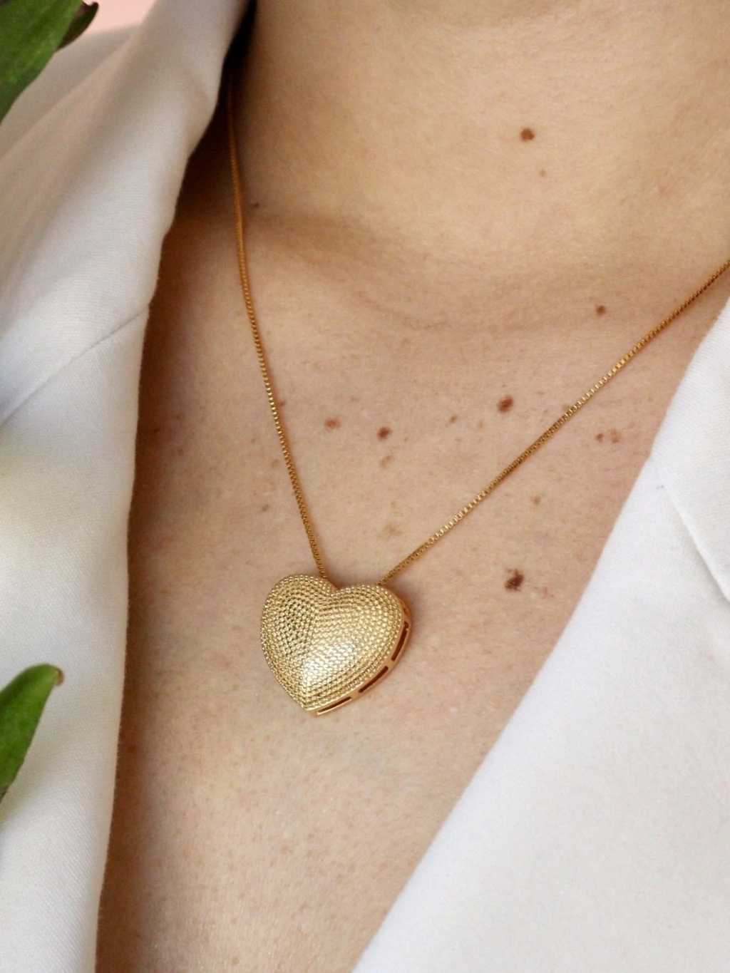 Esse conjunto de colar e brincos é uma semijoia delicada, com pingente e brincos em formato de coração folheado a ouro texturizado, que faz transbordar romantismo ao seu estilo. Seja no dia a dia ou em momentos especiais, este conjunto será o destaque perfeito para expressar sua autenticidade.
