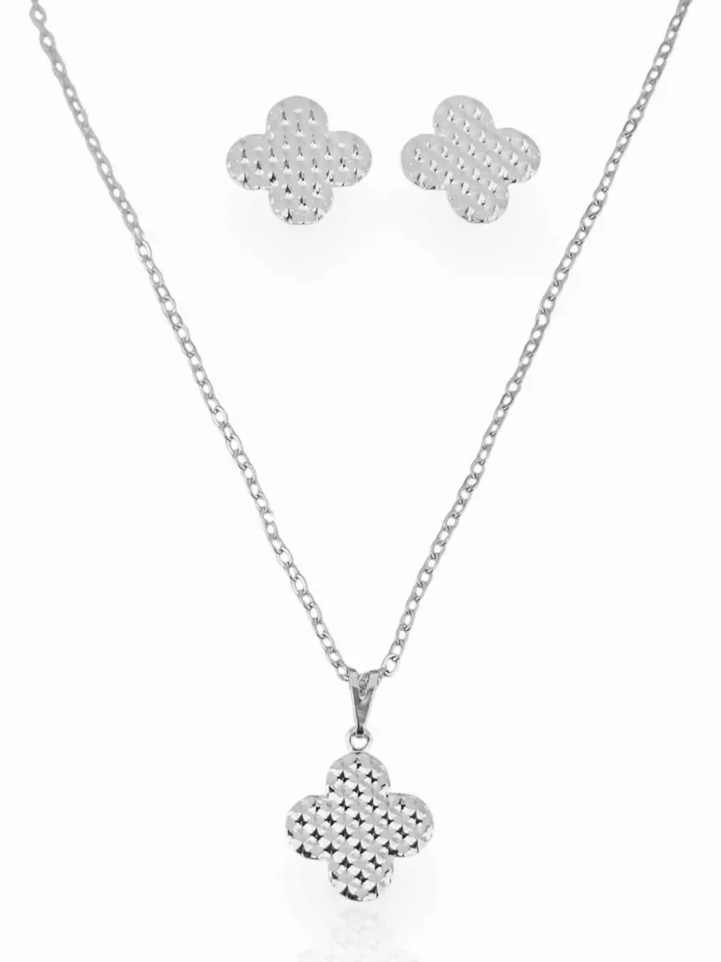 Conjunto Colar e Brincos Trevo Prata Texturizado