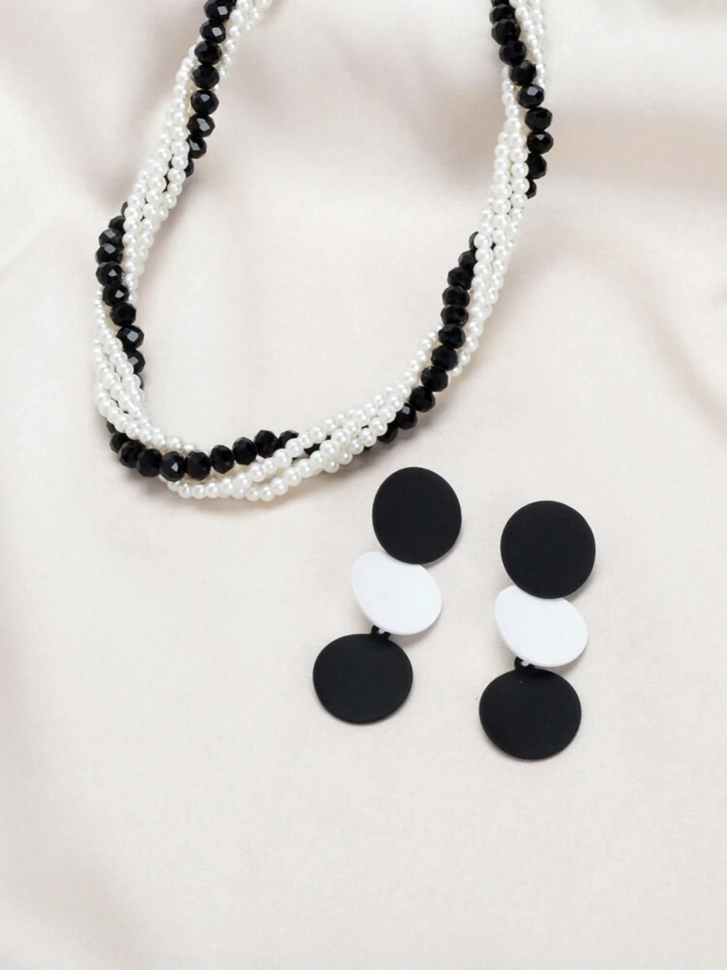 Design: 4 colares com pedras pretas e pérolas trançadas, e brincos com 3 círculos esmaltados nas cores preta e branca