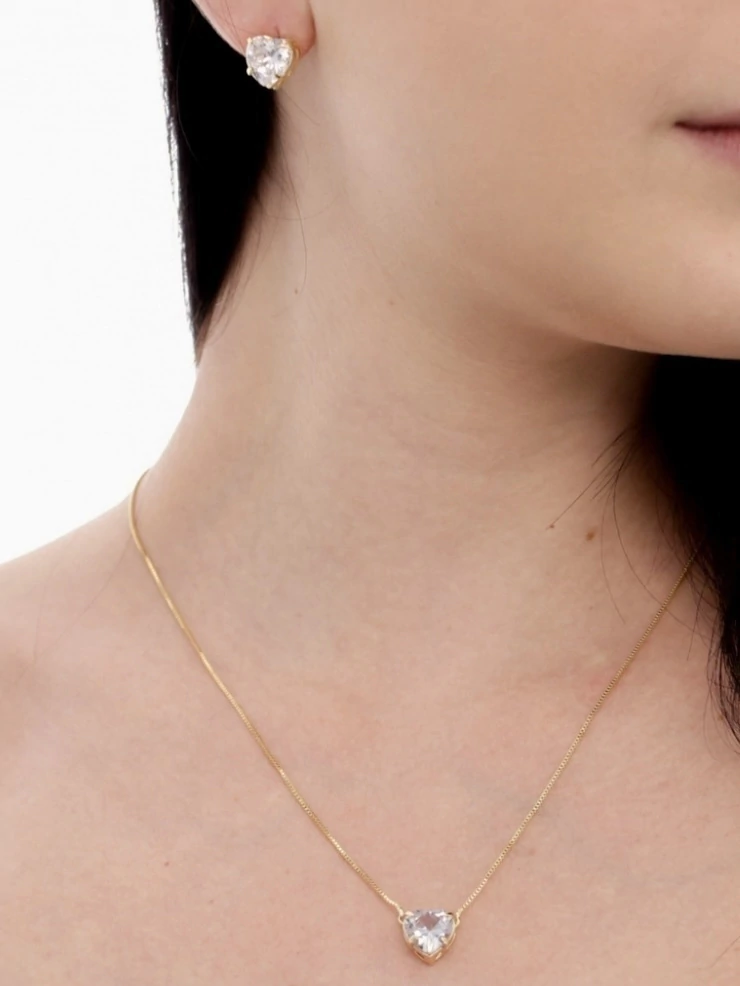 Esse conjunto de colar e brincos é uma semijoia delicada, com zircônias em formato de coração na cor cristal que faz transbordar romantismo ao seu estilo. Seja no dia a dia ou em momentos especiais, este conjunto será o destaque perfeito para expressar sua autenticidade.